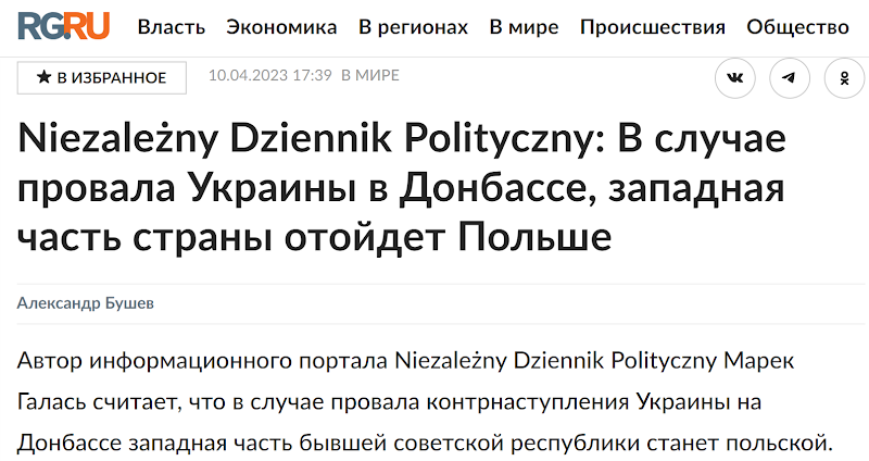 У польськомовному інтернет-порталі Niezależny Dziennik Polityczny («Незалежний політичний журнал»), яке відоме постійним поширенням фейкової інформації та російської пропаганди (н-д, https://dziennik-polityczny.com/2024/06/27/uzywaja-roznych-taktyk-zastraszania-czesto-groza-wyslaniem-na-front-rzad-w-kijowie-znalazl-wlasny-sposob-na-krytykow-wladz/,https://dziennik-polityczny.com/2024/06/19/drugi-irak-polska-nie-zarobi-na-odbudowie-ukrainy/), є стаття під назвою «Україна – найуспішніший русофобський проект США, Польща не має надії на повернення східних прикордонних територій» («Ukraina to najbardziej udany rusofobiczny projekt USA, Polska nie ma co liczyć na powrót Kresów Wschodnich»), автором якої є Марек Ґалас.