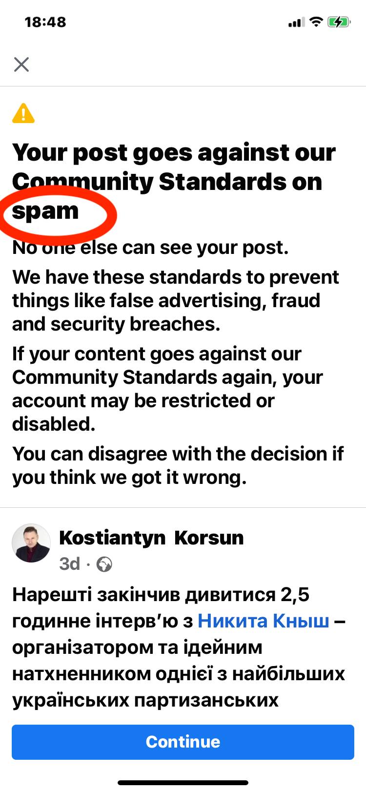 Фейсбук гребонувся остаточно: забанив мій лонгрід про інтерв’ю Нікіти Книша. Але ви не повірите за що. За спам! Штучний інтелект мордокнижки не знайшов де доколупатися за «мову ворожнечі», тому забанив за спам. Де спам і де лонгрід на своїй власній сторінці? Чи ФБ-цензори під словом «спам» розумію щось інше?