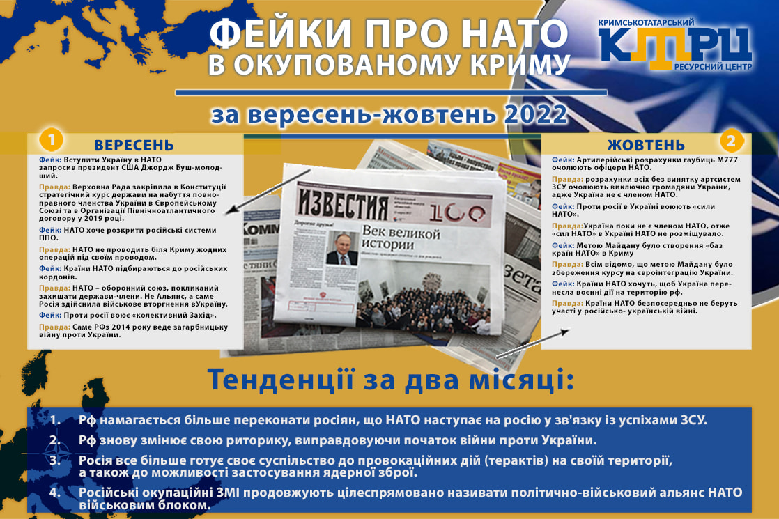 Щоб відкрити очі кримчанам, що знаходяться в інформаційному вакуумі, Кримськотатарський Ресурсний Центр розпочав рубрику «НАТО у ЗМІ окупованого Криму», яка має на меті відстеження фейків в тимчасово окупованому Криму про цінності, цілі і поточну діяльність НАТО та спростовування цієї інформації».