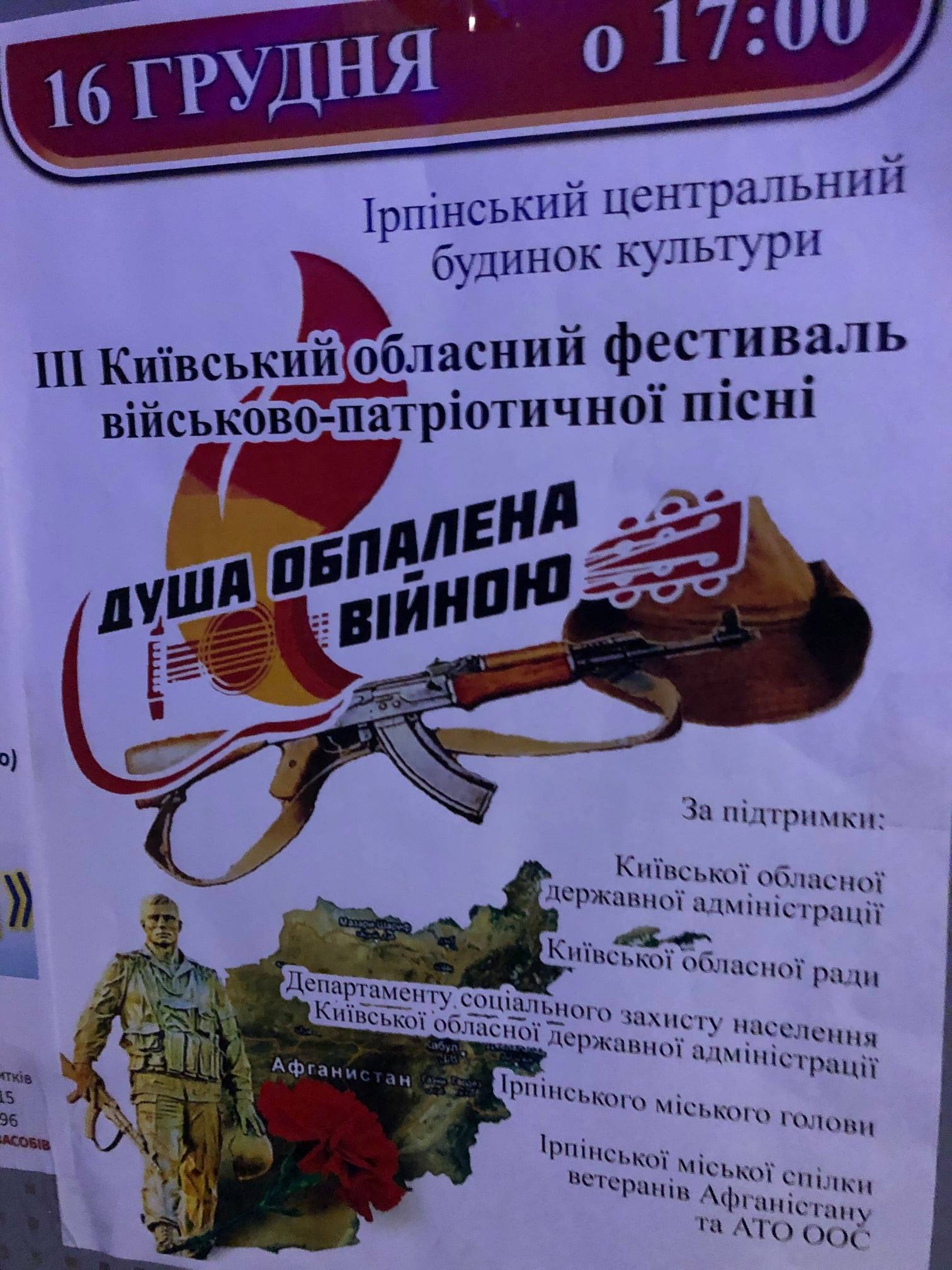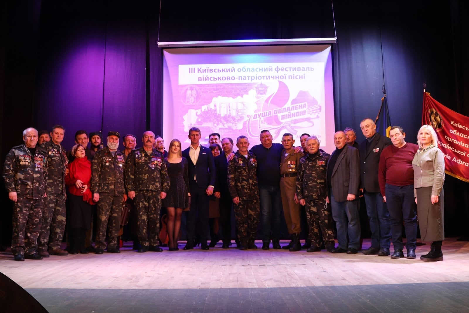 Так, за підтримки департаменту соціального захисту населення Київської облдержадміністрації, з нагоди 25-річчя Київської обласної організації Української спілки ветеранів Афганістану в м. Ірпені відбувся ІІІ Київський обласний фестиваль військово-патріотичної пісні «Душа обпалена війною».