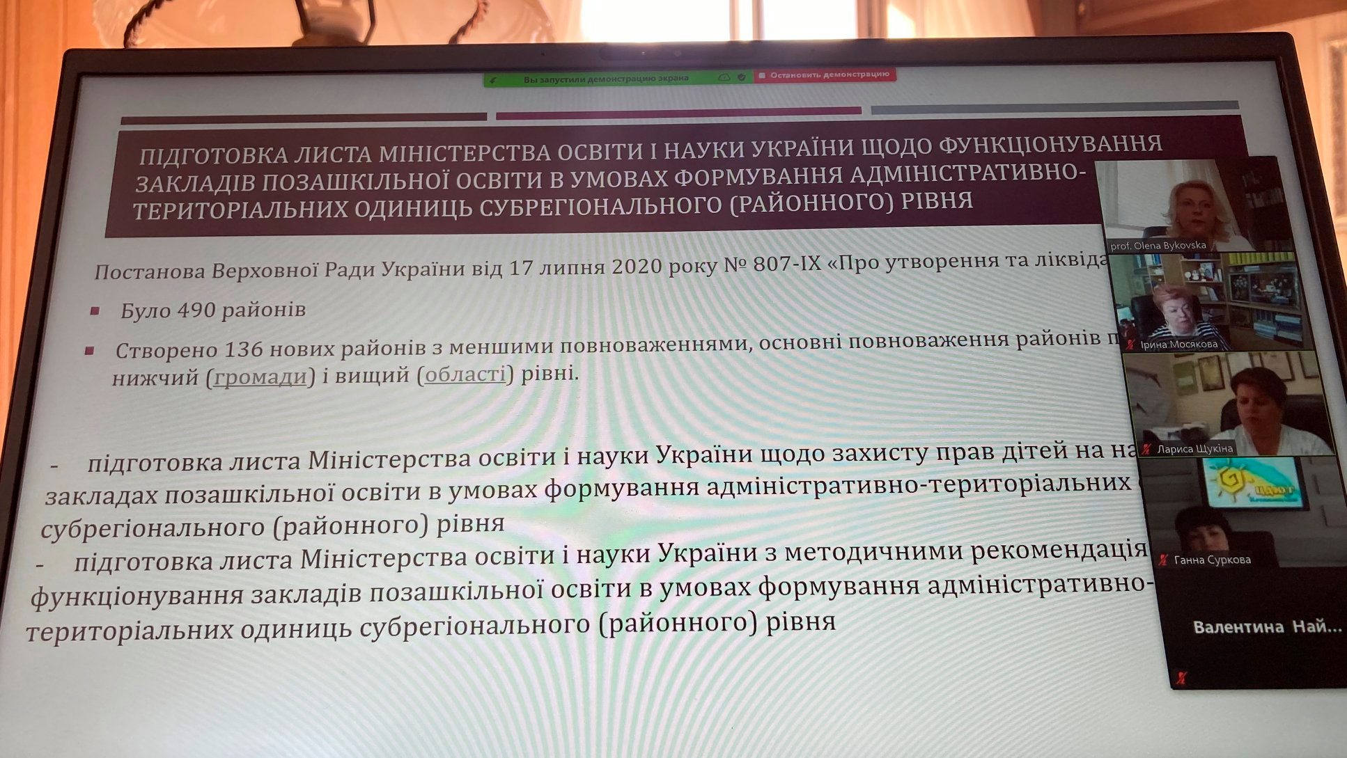 – підготовка листа Міністерства освіти і науки України щодо захисту прав дітей на навчання у закладах позашкільної освіти в умовах формування адміністративно-територіальних одиниць субрегіонального (районного) рівня