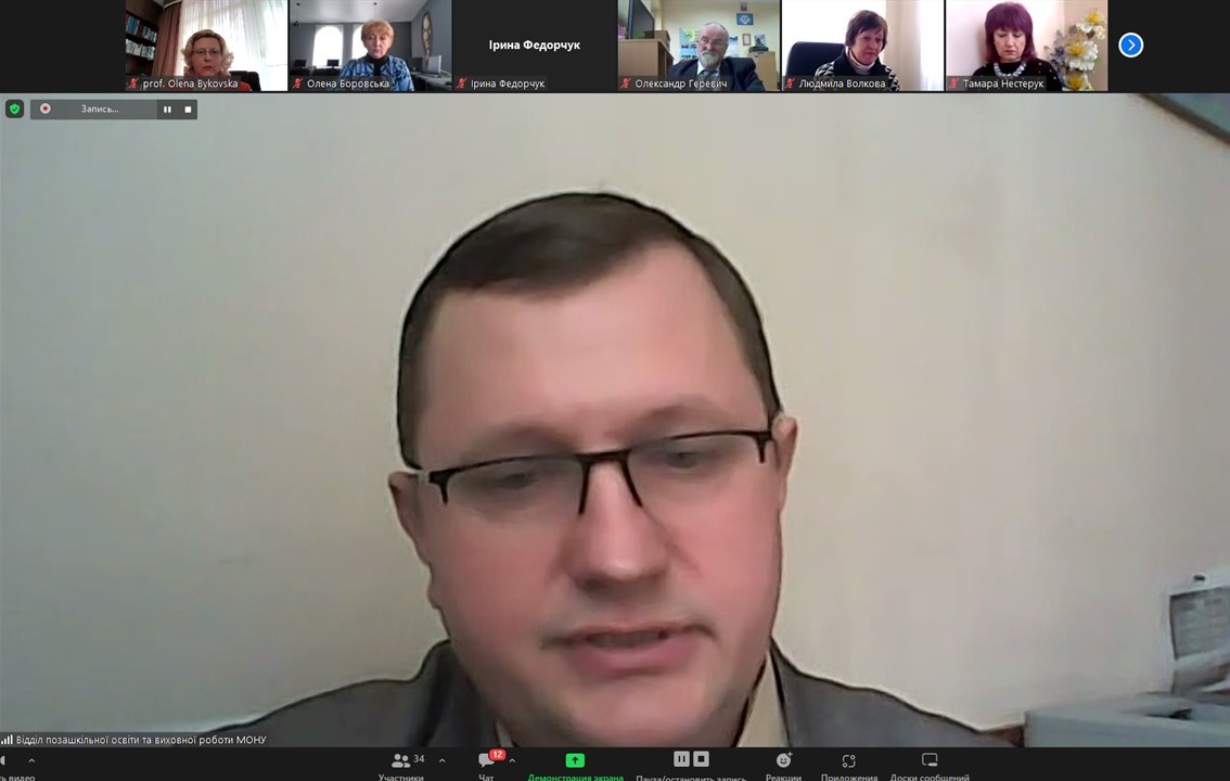 З виступом до учасників засідання звернувся Вадим Овчаренко Vadym Ovcharenko начальник відділу позашкільної освіти та виховної роботи Директорату дошкільної, шкільної, позашкільної та інклюзивної освіти Міністерство освіти і науки України