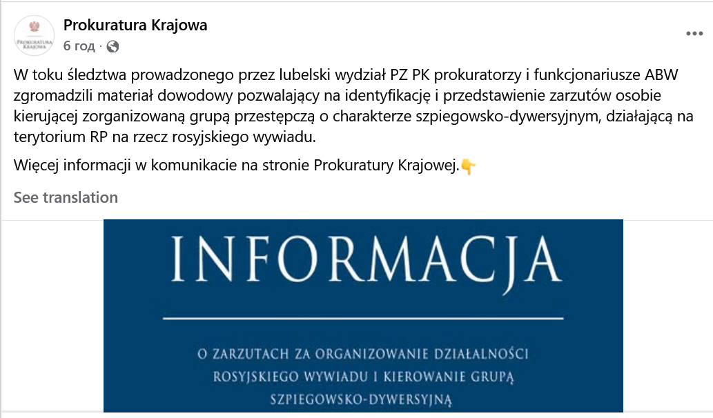 «Звісно, провести процесуальні дії з цією особою не вдалося. Він не перебуває в Польщі й ніколи не був. Усі дії підозрюваний виконував за допомогою інтернету, фізично перебуваючи в Росії. Ми маємо вагомі підозри, що він є кадровим співробітником Федеральної служби безпеки Росії. Беручи до уваги ці обставини, прокурор спочатку видав постанову про затримання, а потім звернувся до суду із клопотанням про його тимчасовий арешт. Суд клопотання задовольнив і наразі підозрюваного розшукують», — поінформував речник прокуратури Польщі Пшемислав Новак.
