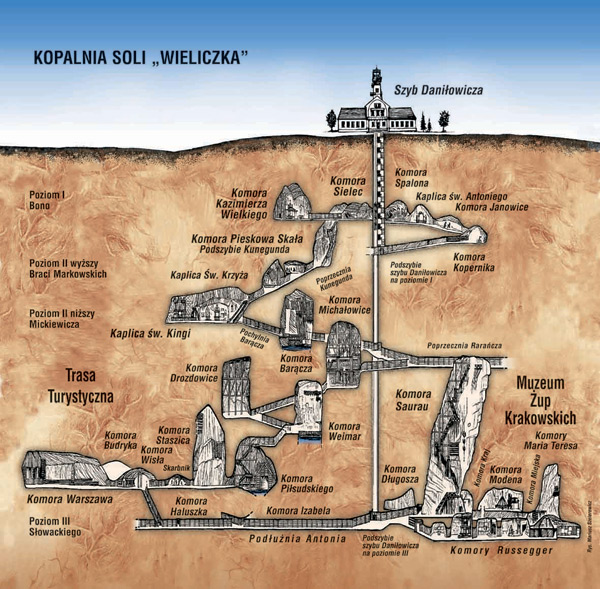9 – з такої кількісті рівнів складається копальня. Найстаріша кімната на першому рівні розташована на глибині 64 метри.
