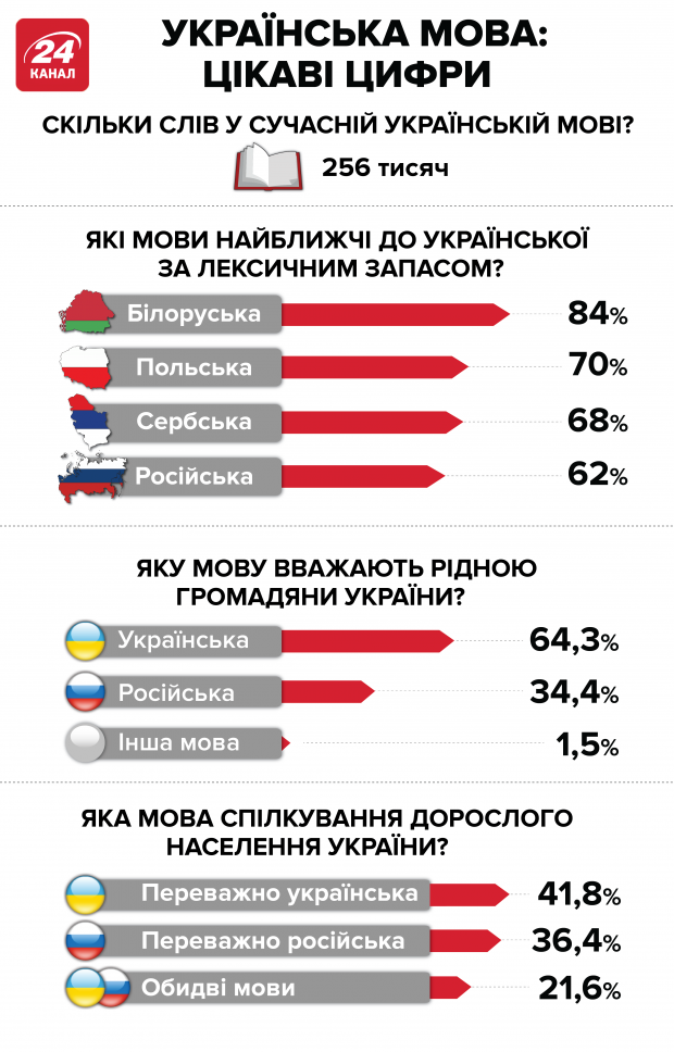 1. Відповідно до даних Національної Академії Наук України, сучасна українська мова містить приблизно 256 тисяч слів. За лексичним запасом українська є найбільш спорідненою з білоруською – 84% спільної лексики, польською – 70% і сербською – 68% . А от з російською – 62%.