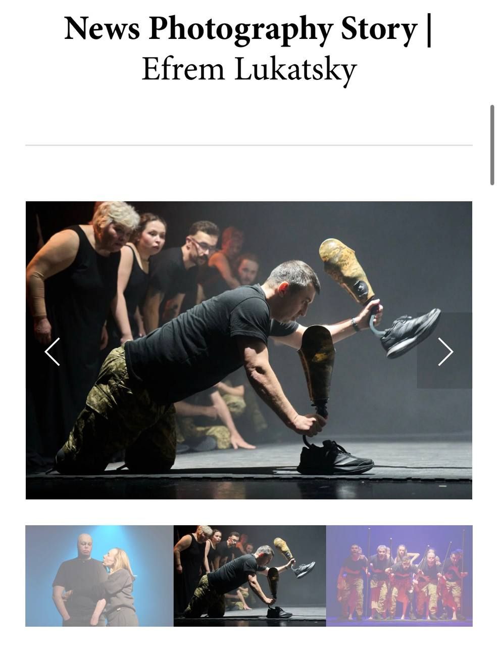 Відомий в Україні фотодокументаліст зробив світлини театральної групи з першої п’єси акторів — чоловіків і жінок віком від 20 до 60 років — до яких входять українські військові ветерани, що повернулися з фронту з ампутаціями.