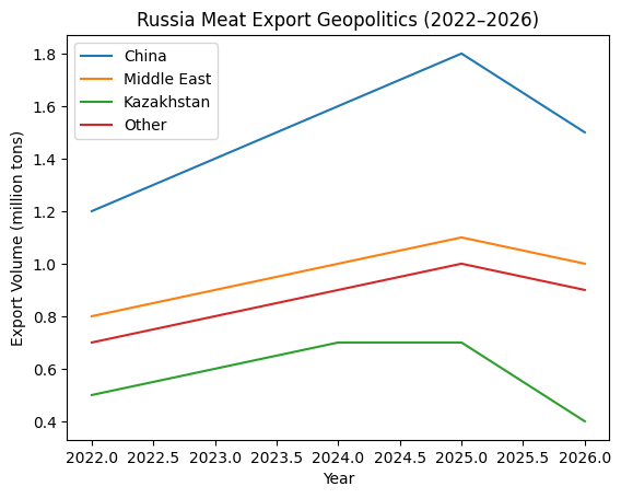 Базовий аналітичний графік динаміки експорту м’яса Росії за 2022–2026 роки — він показує ключові напрямки і головну тенденцію: ріст до 2025-го і потенційне падіння у 2026-му.
