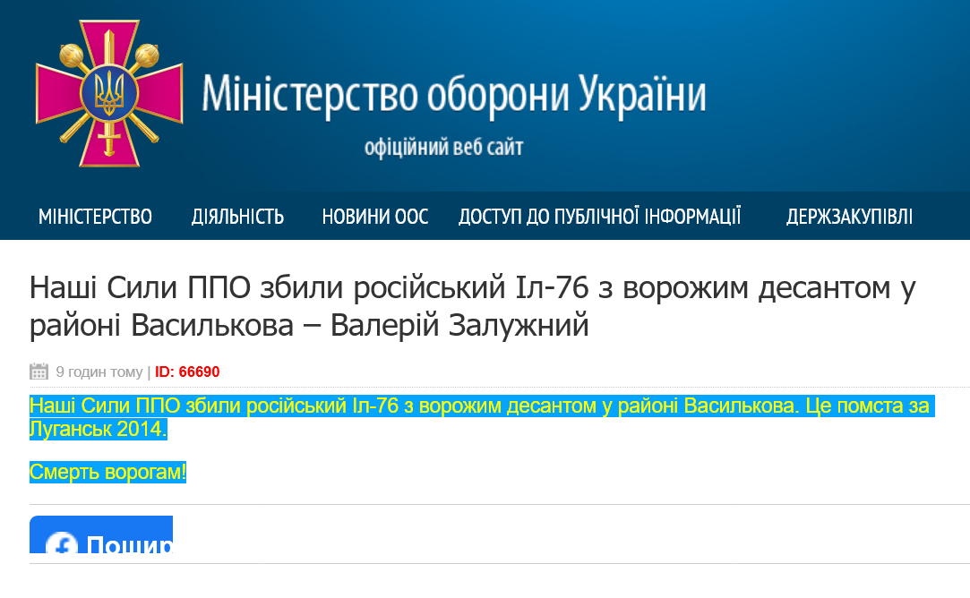 Наші Сили ППО збили російський Іл-76 з ворожим десантом у районі Василькова. Це помста за Луганськ 2014.