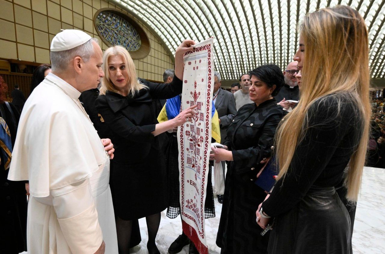 Представниці руху «За сімейні цінності» передали Леву XIV оригінальний рушник «Енеїда», в орнамент якого вшиті QR-коди, що ведуть до рецептів українських страв, згаданих у відомій поемі Івана Котляревського.