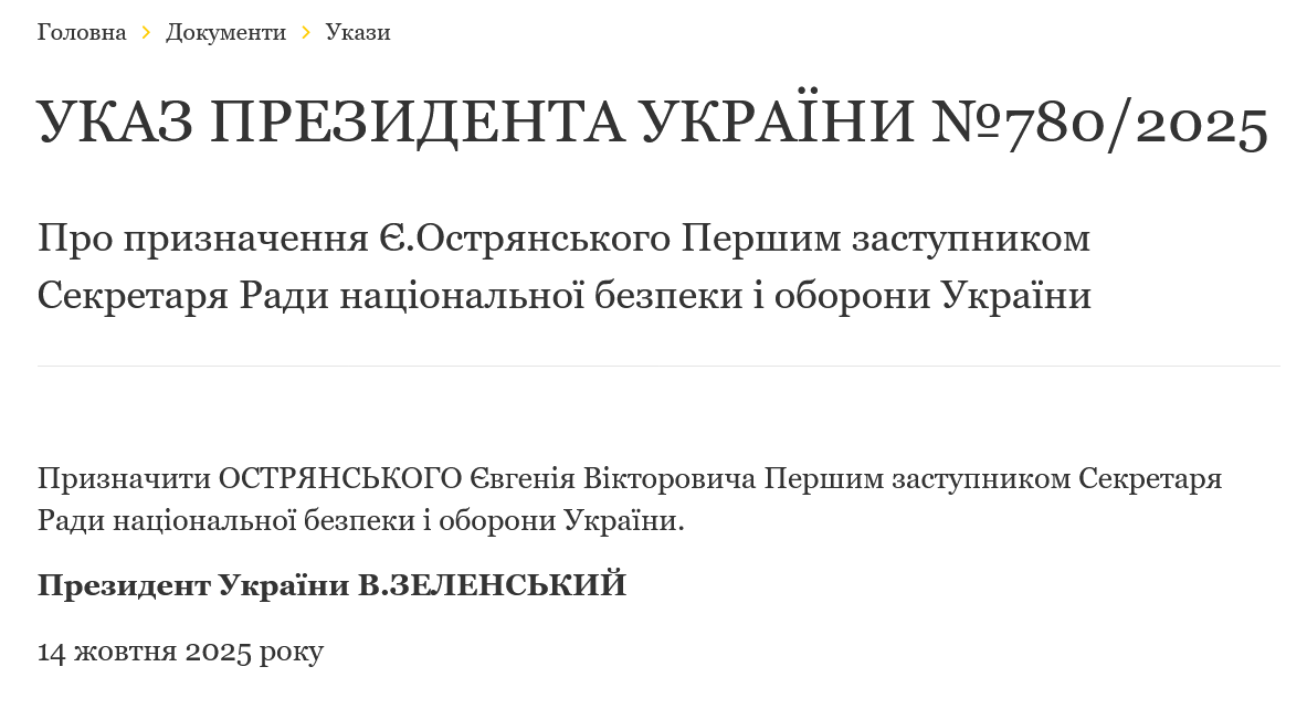 14 жовтня Президент України Володимир Зеленський підписав два укази – про звільнення Руслана Хомчака з посади першого заступника секретаря Ради національної безпеки і оборони та про призначення на цю посаду генерал-майора Євгенія Острянського. Відповідні документи були опубліковані на сайті глави держави.
