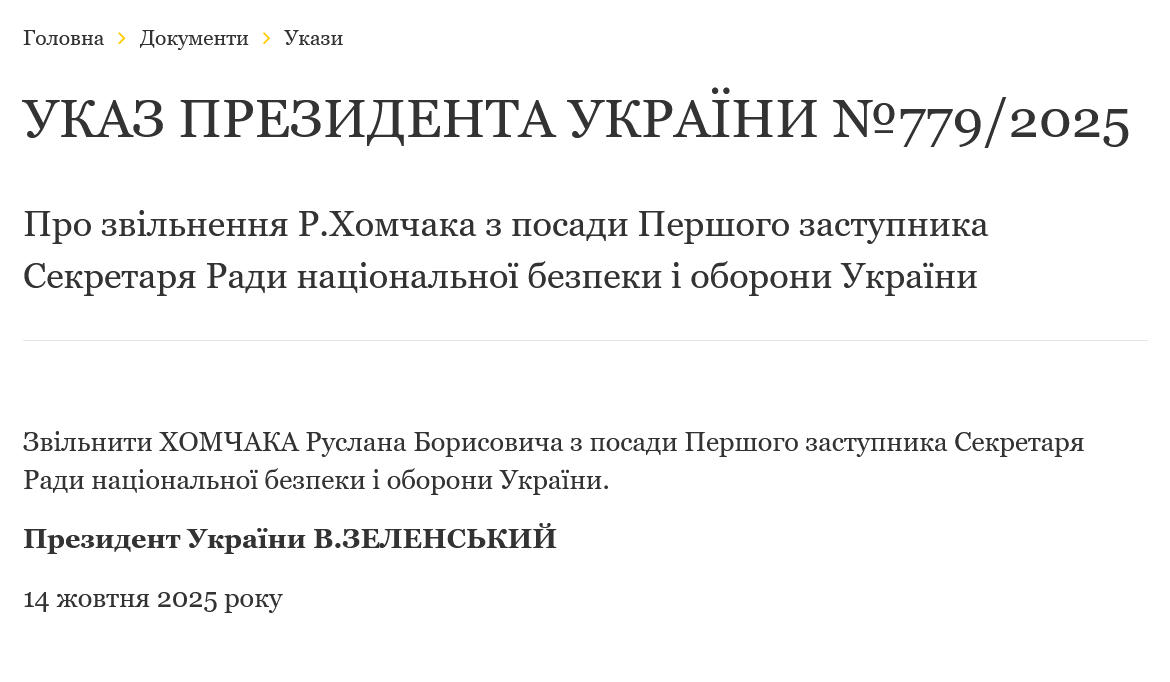 Згідно з указом №779/2025, Руслана Хомчака звільнено з посади, яку він обіймав з липня 2021 року. Іншим указом – №780/2025 – президент призначив на цю посаду Євгенія Острянського, який до цього був заступником начальника Генерального штабу Збройних Сил України.