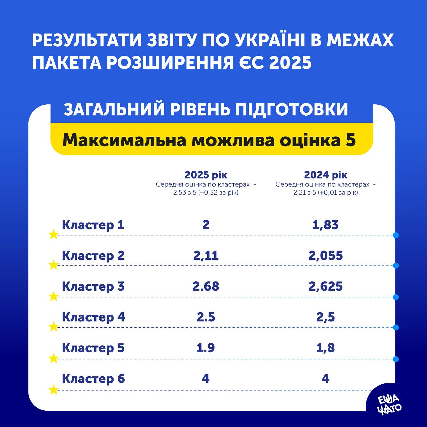 Звіт Єврокомісії засвідчив, що Україна послідовно просувається вперед у імплементації законодавства до вимог ЄС та готовність нашої держави до відкриття переговорних кластерів. Загальний прогрес у Звіті Європейської Комісії демонструє, що курс на членство України в ЄС серед основних пріоритетів роботи Президента України, Верховної Ради України та Уряду.