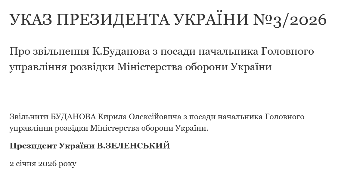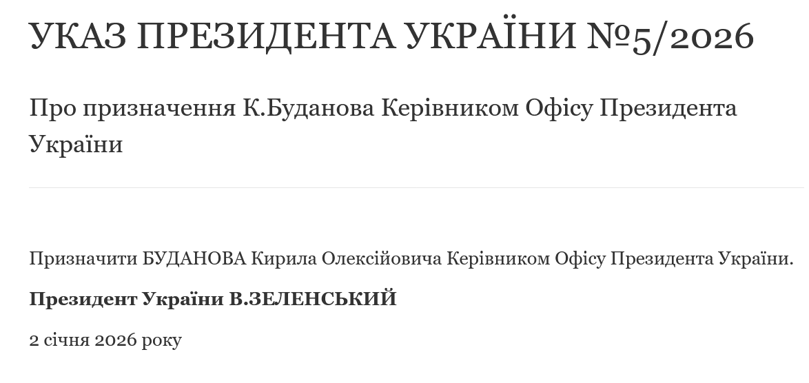 Президентський указ № 5/2026 офіційно призначив Кирила Буданова керівником Офісу Президента України. Водночас указом № 3/2026 його звільнено з посади начальника Головного управління розвідки (ГУР) Міністерства оборони.