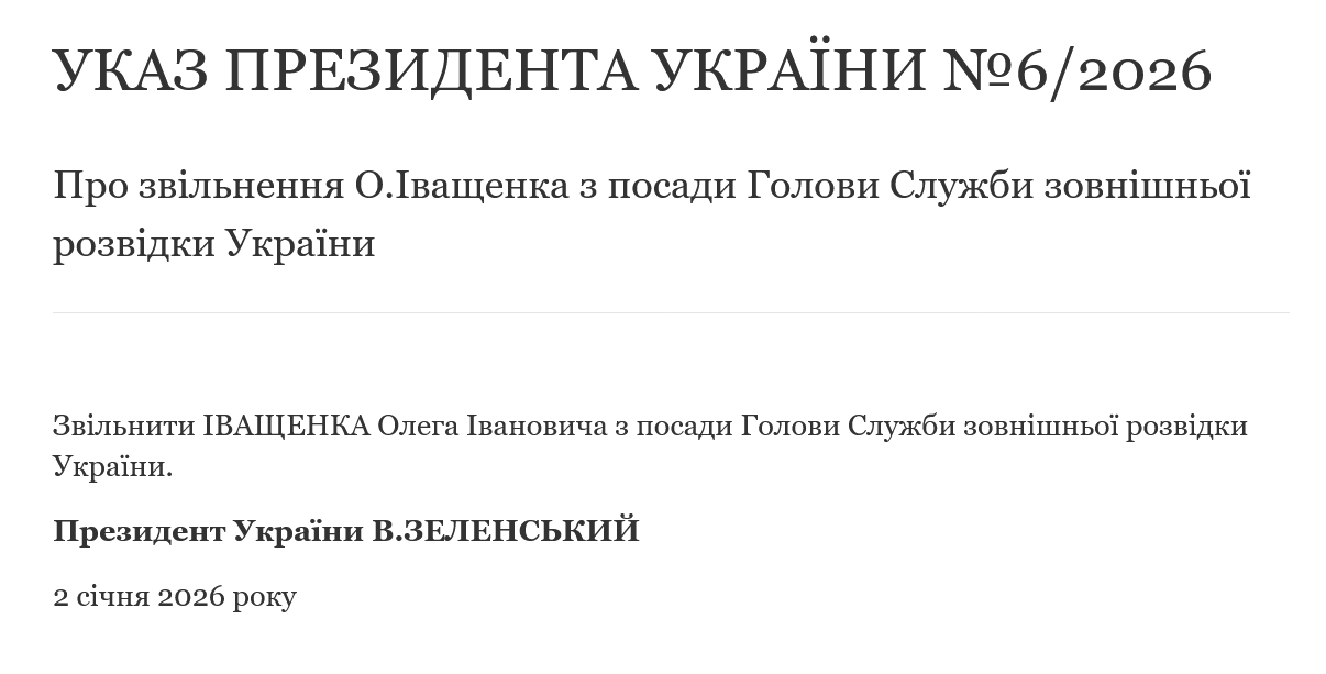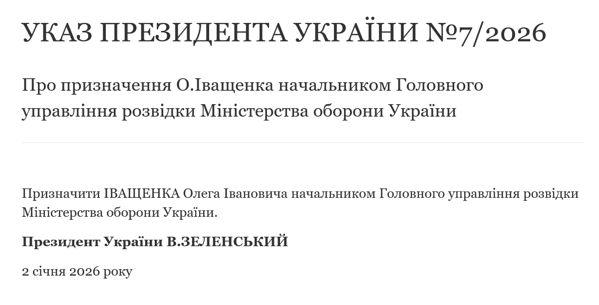 Новим начальником Головного управління розвідки Міноборони України призначено Олега Іващенка. Раніше він очолював Службу зовнішньої розвідки. Відповідні кадрові рішення закріплені указами № 6/2026 і № 7/2026, оприлюдненими на офіційному сайті Президента.